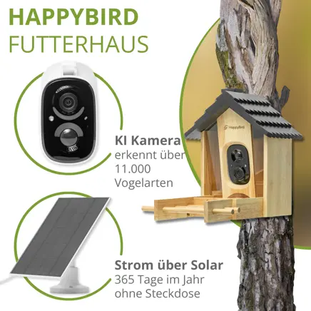 Der HappyBird Futterspender wird über ein effizientes Solarpanel mit Energie versorgt, das den integrierten Akku kontinuierlich lädt. Dadurch können Sie die Kamera 365 Tage im Jahr nutzen, ohne sich um Steckdosen, Kabel oder regelmäßiges Laden kümmern zu müssen.